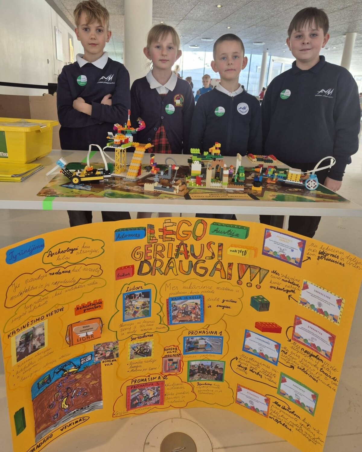 Komanda pristatė savo archeologinį STEAM projektą – idėją, kaip technologijos gali padėti archeologams saugiau ir efektyviau tyrinėti kasinėjimų vietas. Mokiniai pasiūlė naudoti robotizuotas mašinas ir sensorius, kurie galėtų skenuoti žemę, padėti aptikti radinius ir juos saugiai iškelti, nepažeidžiant istorinių artefaktų.