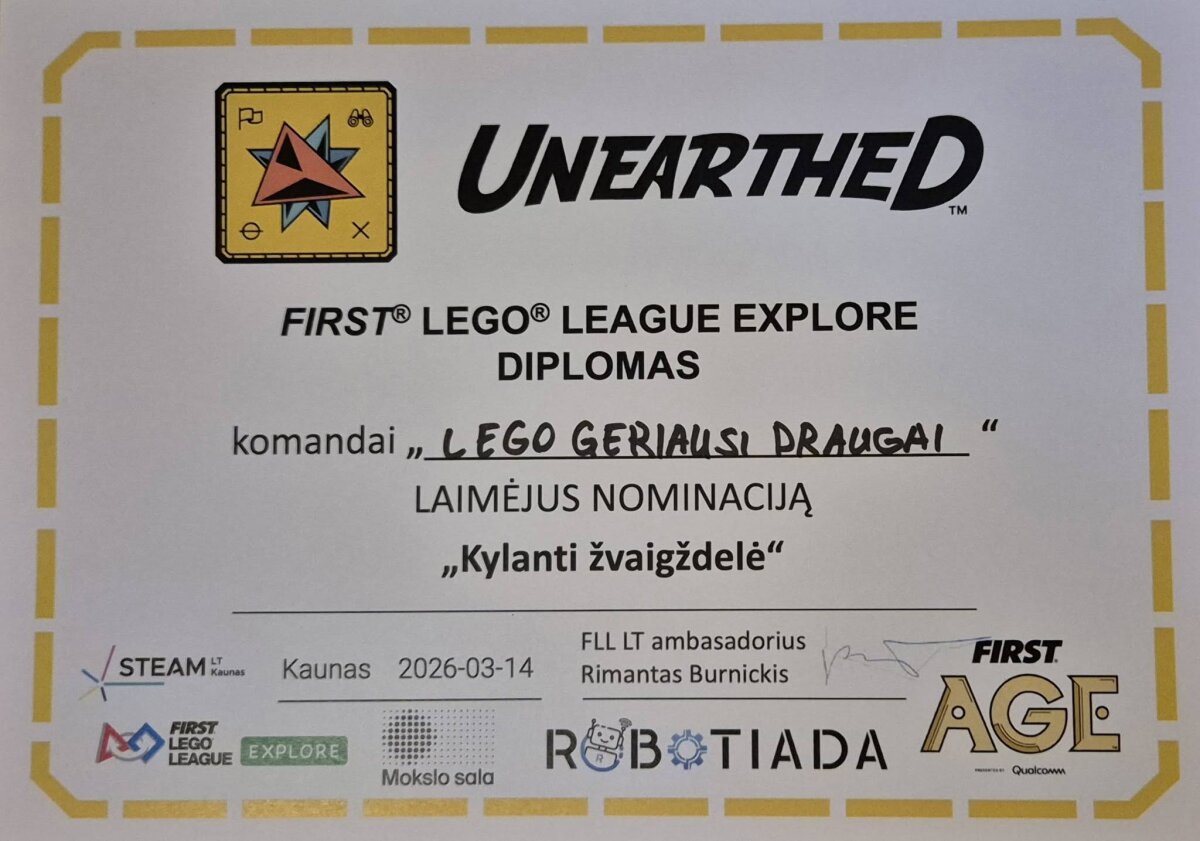 Kovo 14 d. mūsų mokyklos antrokų komanda „Geriausi Lego draugai“, kurią sudarė: Adomas Laureckis, Erikas Liaukevičius, Austėja Talitavičiūtė ir Mantvydas Grigelis, dalyvavo FFL (First Lego League) nacionalinėse varžybose „Mokslo saloje“, kuriose susirinko net 33 komandos iš visos Lietuvos.
